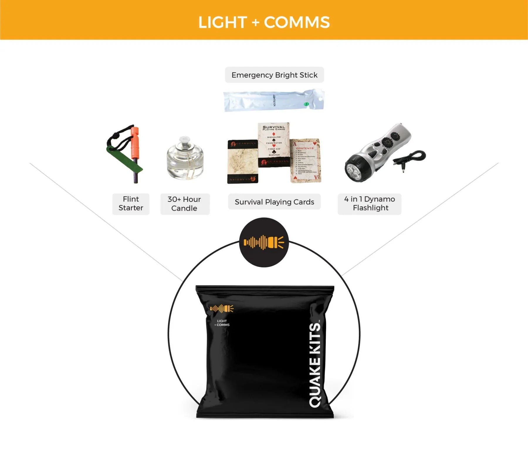 - Light + Communications: Survival Playing Cards, Long-Burning Candles, Emergency Bright Sticks, Dynamo Flashlights/Radios, Flint Starters.